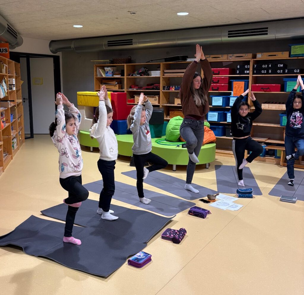 Anschließend folgte eine kleine Yogaeinheit. Durch einfache Bewegungen lernten die Kinder, ihren Körper bewusster wahrzunehmen und sich besser zu konzentrieren.